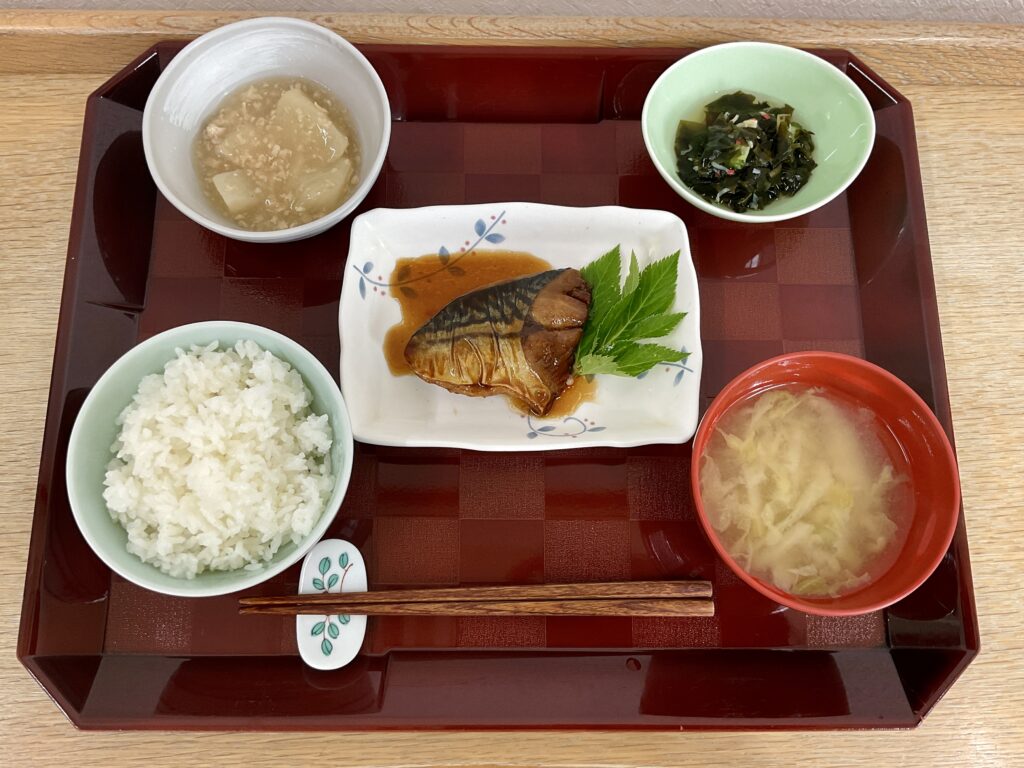 ご飯🍚、さばの照り焼き、かぶのそぼろあんかけ、わかめの酢の物カニカマ入り、みそ汁(白菜、玉ねぎ)
