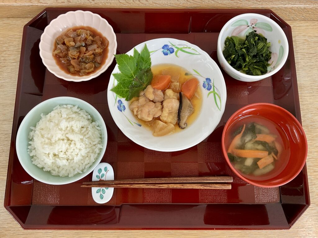 ご飯、鶏肉と大根の煮物、なすのトマト煮、ほうれん草ナムル🥬、みそ汁(小松菜、人参)