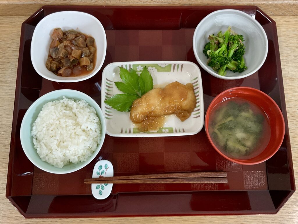 ご飯、白身魚の揚げ煮、なすのトマト煮、ブロッコリーのおひたし🥦、みそ汁(小松菜、麩)