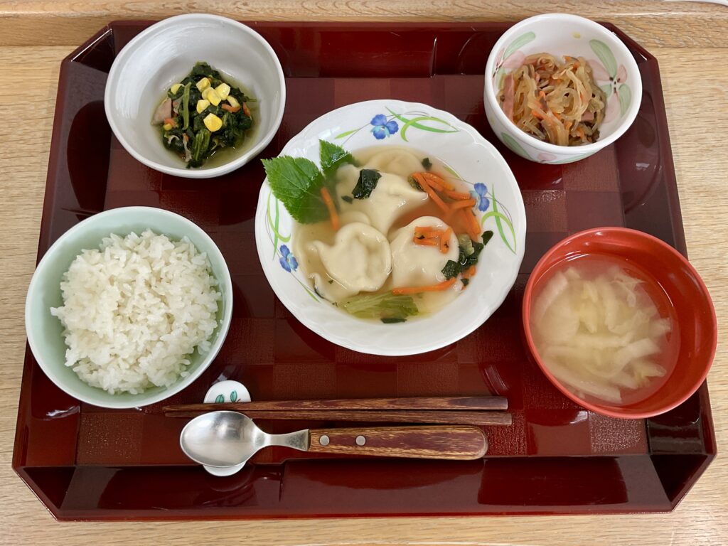 ご飯、スープ餃子🥟、ほうれん草とベーコンのソテ―、春雨サラダ、みそ汁(白菜、玉ねぎ)