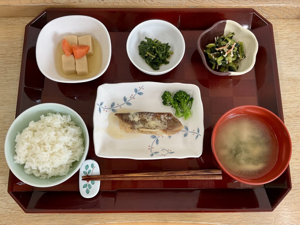 ご飯🍚、めばる旨煮(ブロッコリー添え)、高野豆腐と人参の炊き合わせ、青菜の磯和え、しどけのナムル✨、みそ汁(畑菜、油揚げ)