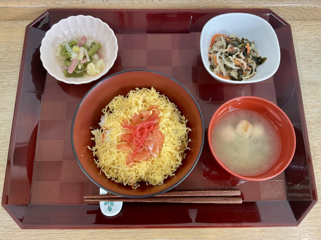 ちらし寿司(錦糸卵、サーモンパティ入り)🌸、いんげんとハムのコンソメ煮、千切り大根胡麻酢和え、みそ汁(畑菜、麩)