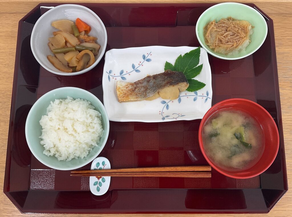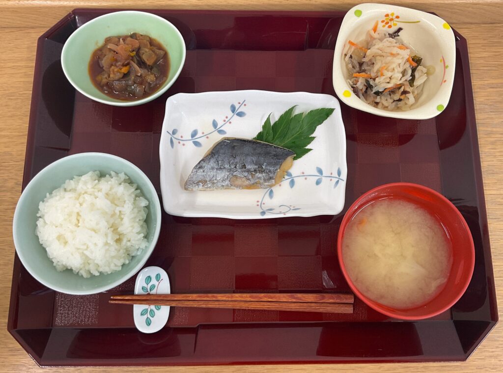 ご飯、さわら白だし焼き、茄子🍆のトマト煮、切り干し大根ごま酢和え、みそ汁(玉ねぎ、わかめ)