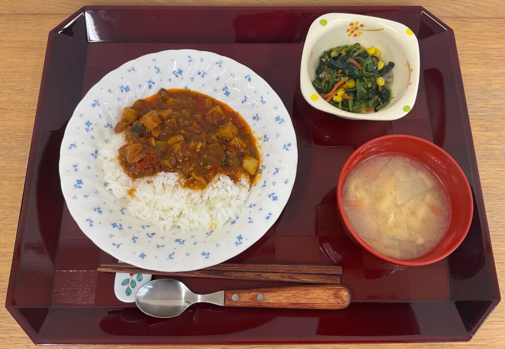 ご飯、豆腐と野菜カレー🍛、ほうれん草とベーコンのソテー、みそ汁(大根、人参、油揚げ)