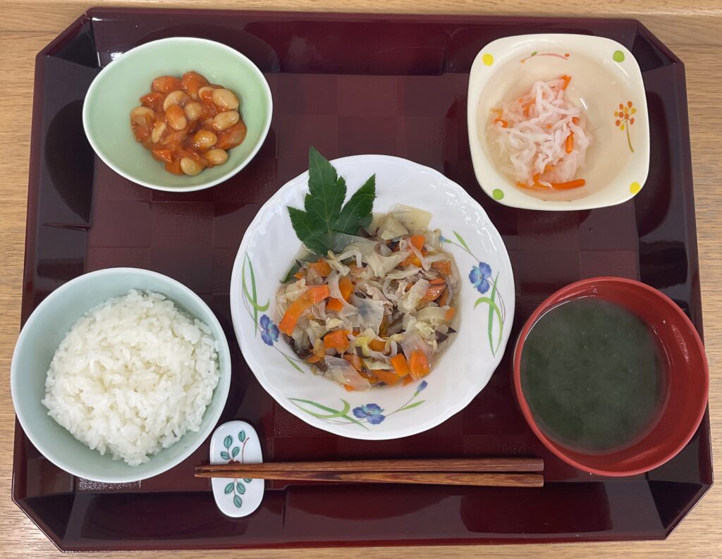 ご飯、肉野菜炒め、トマト🍅チキンビーンズ、紅白なます、みそ汁(あおさのり)