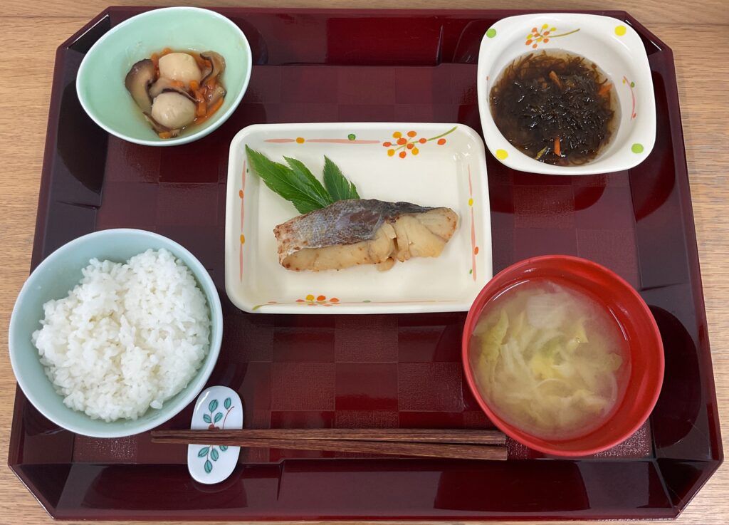 ご飯、白糸ダラ🐟西京焼き、里芋のあんかけ、柚子もずく、みそ汁(白菜、玉ねぎ)