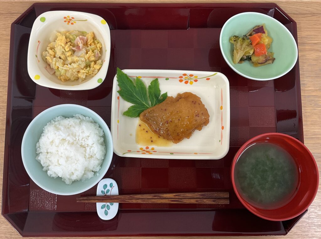 ご飯、もうかカツハニーマスタード、白菜とベーコンのコンソメ煮、彩り野菜🥕の醬油仕立て、みそ汁(あおさのり)