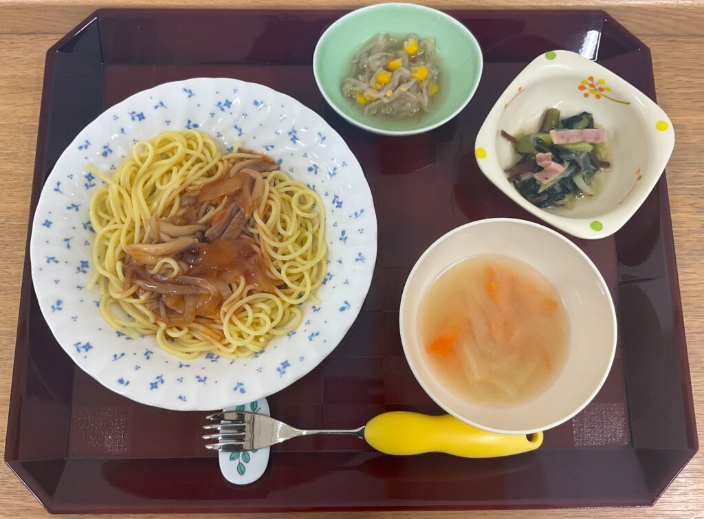 餡かけスパゲッティ🍝、青梗菜の旨味炒め、もやしのナムル、みそ汁(大根、人参、油揚げ)