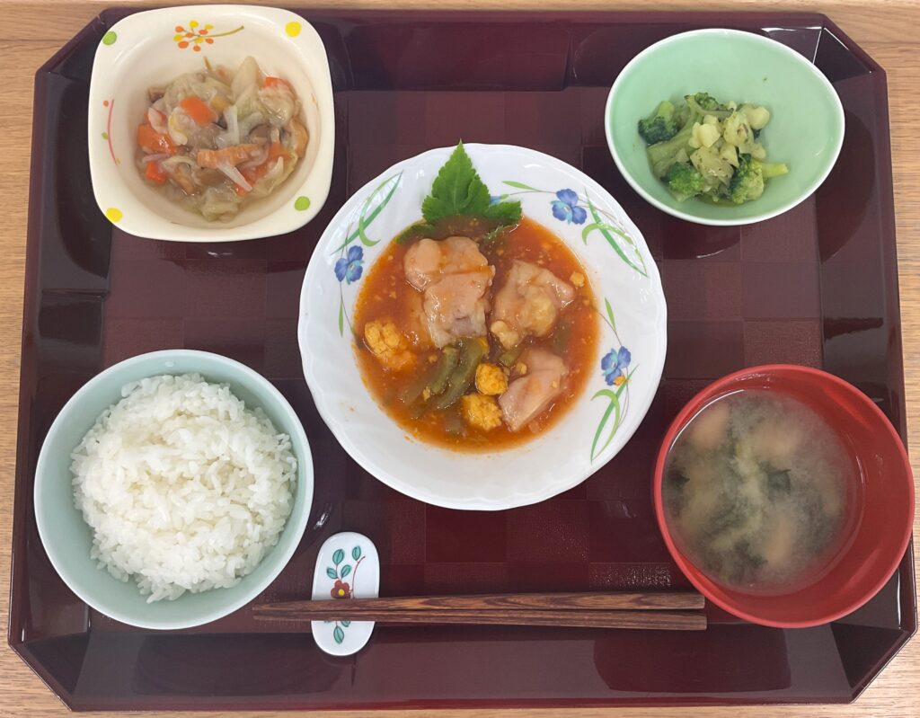 ご飯、鶏肉のチリソース煮込み、白菜の中華煮、ブロッコリー🥦のバジルマリネ、みそ汁(小松菜、麩)