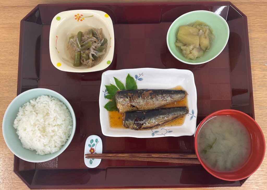 ご飯、いわしの煮付け、もやしといんげんの炒め煮、なす🍆のお浸し、みそ汁(豆腐、わかめ)