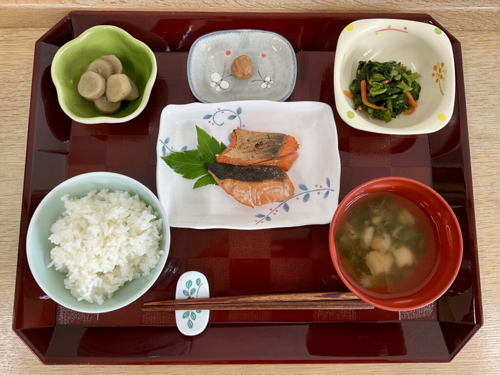 ご飯、ホッケみりん焼き、柔らかごぼう煮、ほうれん草胡麻和え、みそ汁(キャベツ、人参🥕)