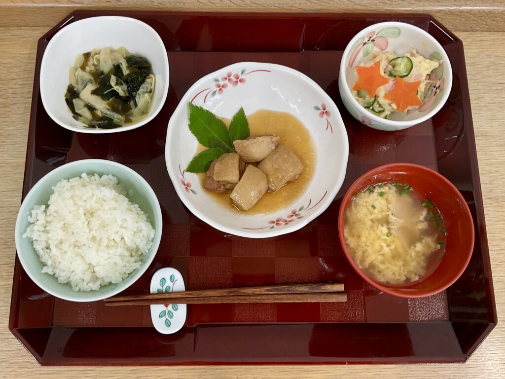 ご飯、豚角煮、ポテトサラダ、姫皮竹の子の磯煮、かき玉汁🥚