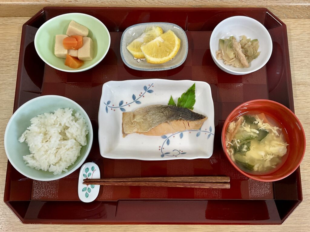 ご飯、マスの旨塩焼き、高野と人参の炊き合わせ、蒸し鶏ザーサイ、みそ汁(小松菜🥬、人参、卵)