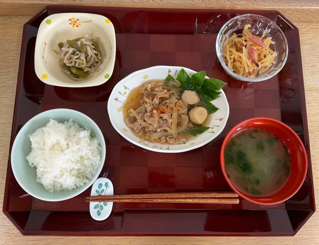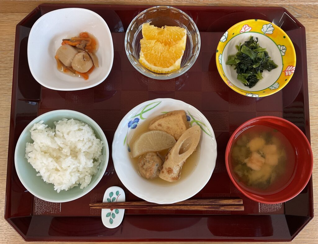 ご飯、関西風おでん🍢、里芋のあんかけ、ほうれん草のナムル、みそ汁(畑菜、麩)、デザート(カットみかん)