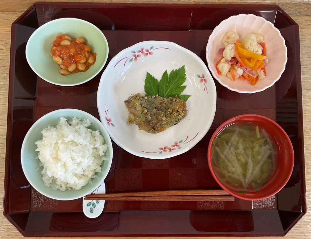 ご飯、あじ香草焼き、トマト🍅チキンビーンズ、カリフラワーマリネ、みそ汁(大根)