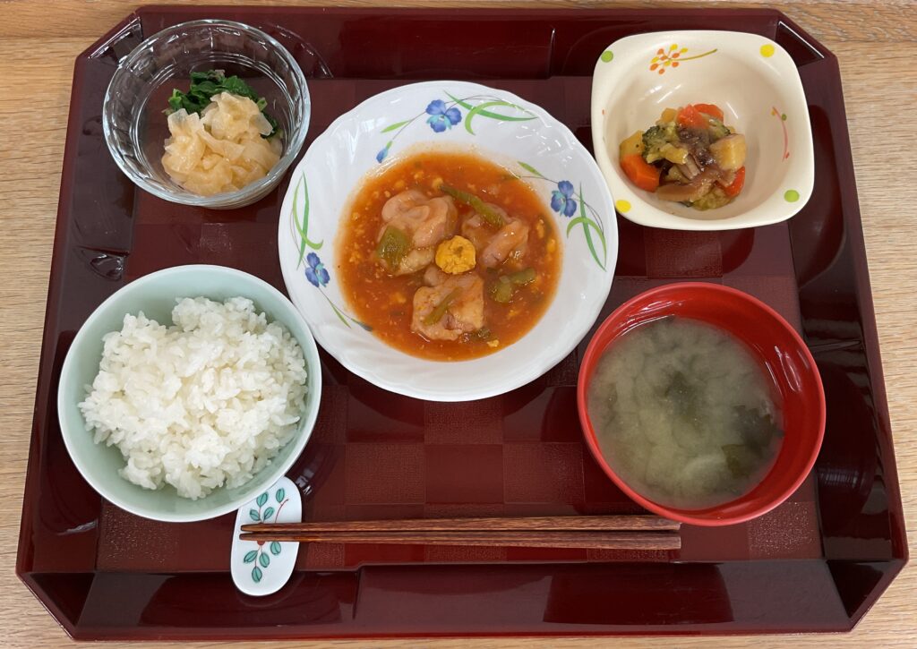 ご飯、鶏肉のチリソース煮込み、彩り野菜の醤油仕立て🥦、大根フレンチサラダ、みそ汁(玉ねぎ、かわめ)