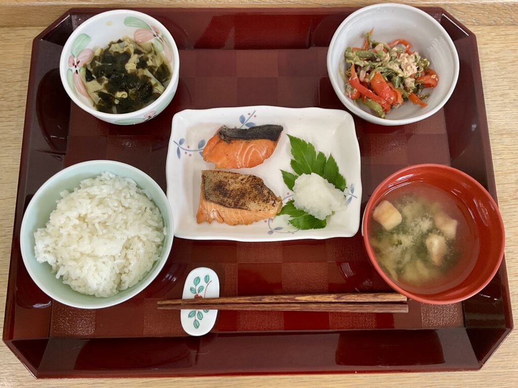 ご飯🍚、炭火焼紅鮭切身、ピーマンのツナ和え✨、姫皮竹の子の磯煮、みそ汁(畑菜、麩)