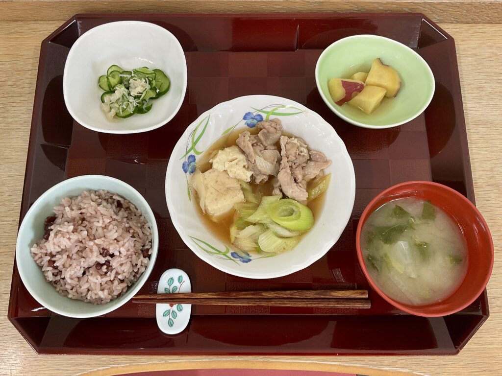 赤飯🎉、肉豆腐、さつま芋甘煮、きゅうりとホタテの酢の物、みそ汁(大根、大根葉)