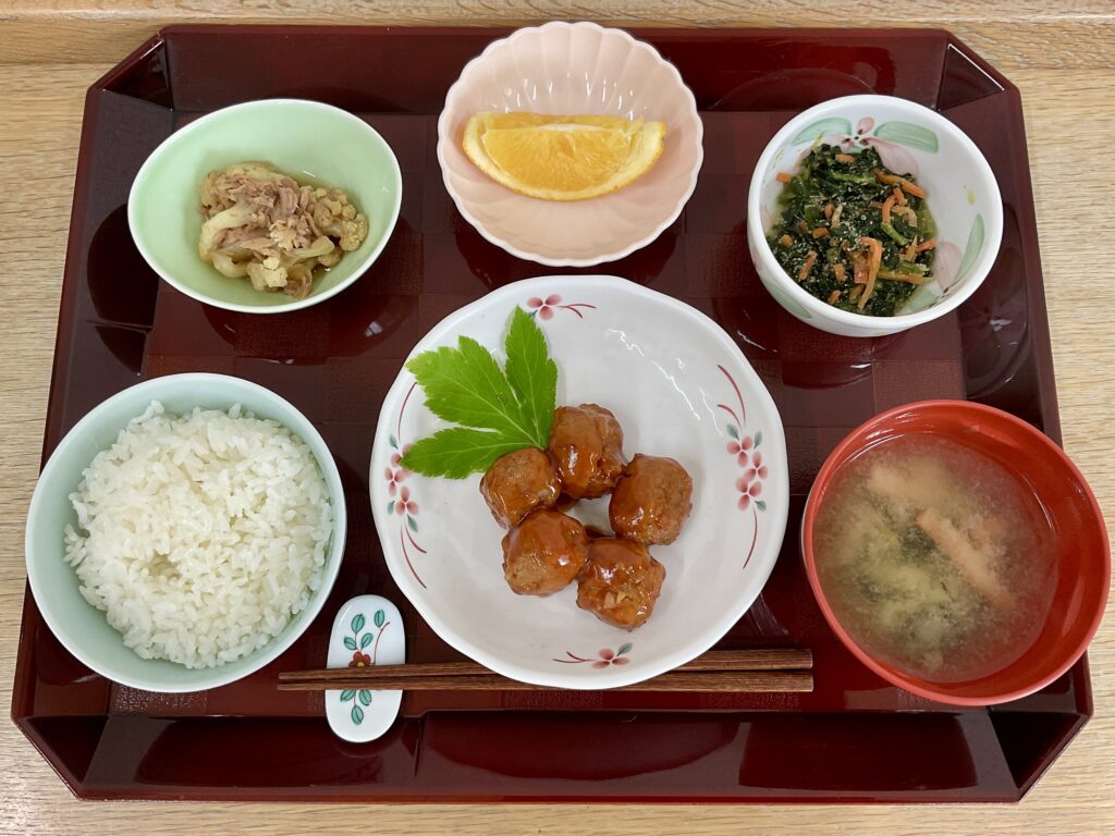 ご飯、鶏肉団子の甘酢あん、ほうれん草の胡麻和え🥬、カリフラワーのツナ煮、みそ汁(小松菜、人参)甘夏みかん