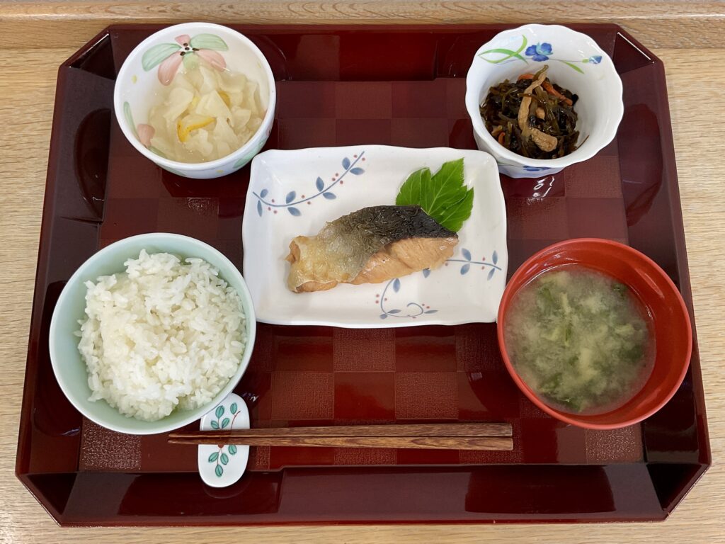 ご飯、マス旨塩焼き、五目生昆布煮、ゆず大根、みそ汁(畑菜🥬、油揚げ)