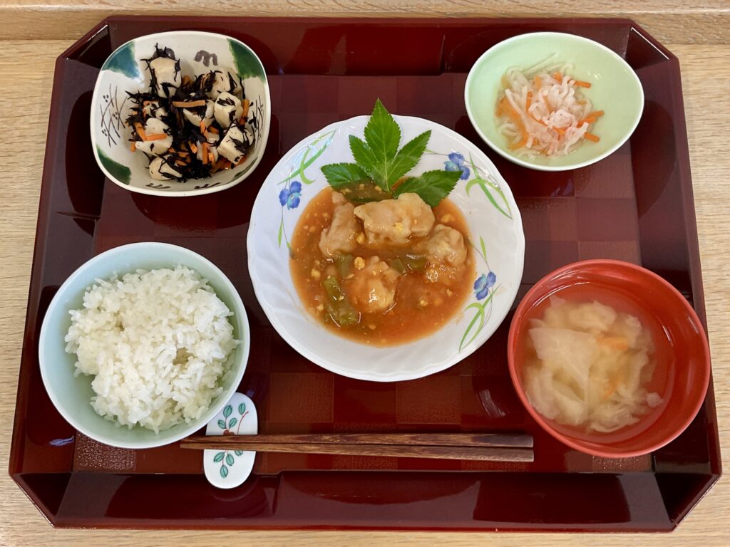 ご飯、鶏肉のチリソース煮込み🔥、ひじきと高菜の煮物、国産紅白なます、みそ汁(キャベツ、人参)