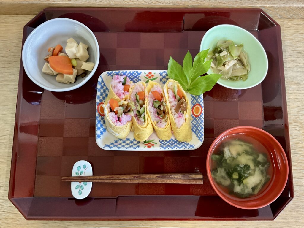 恵方巻(薄焼き卵巻き)✨、高野豆腐五目煮、蒸し鶏ザーサイ、みそ汁(小松菜、麩)
