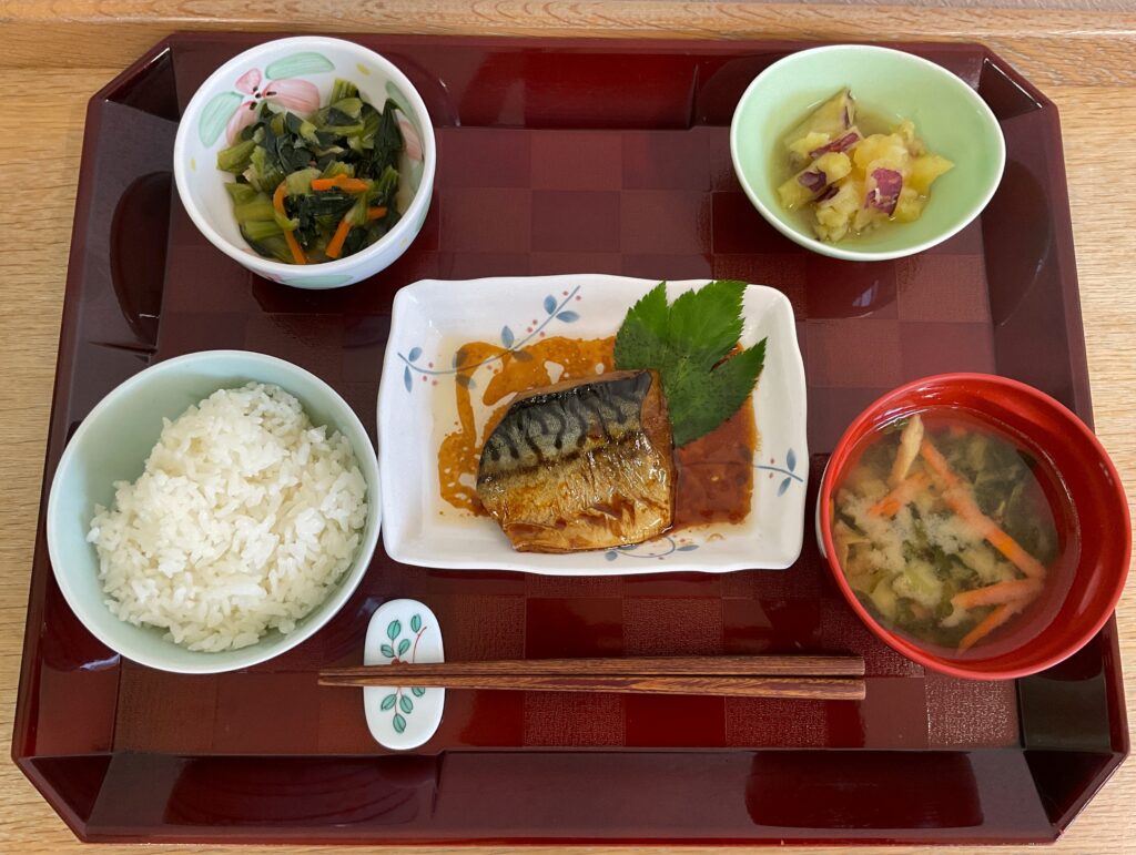 ご飯、さばの照り焼き、さつま芋甘煮、チンゲン菜信田和え、みそ汁(人参🥕、畑菜、油揚げ)