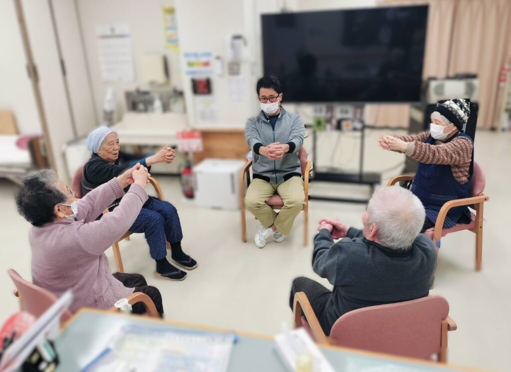 社協でもレクリエーションを行う時がありますが、その際に椅子に座ったままできる身体をひねる運動・もも上げ・深呼吸を行いました💪