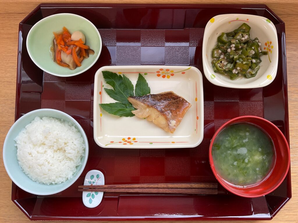 ご飯、赤魚利休焼き、青梗菜🥬の旨味炒め、白菜のなめ茸和え、みそ汁(根菜、油揚げ)
