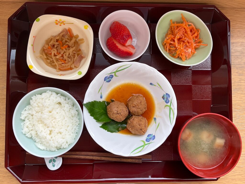 ご飯、鶏つくね、切干の洋風煮、ツナマヨサラダ、みそ汁(根菜、麩)、いちご🍓
