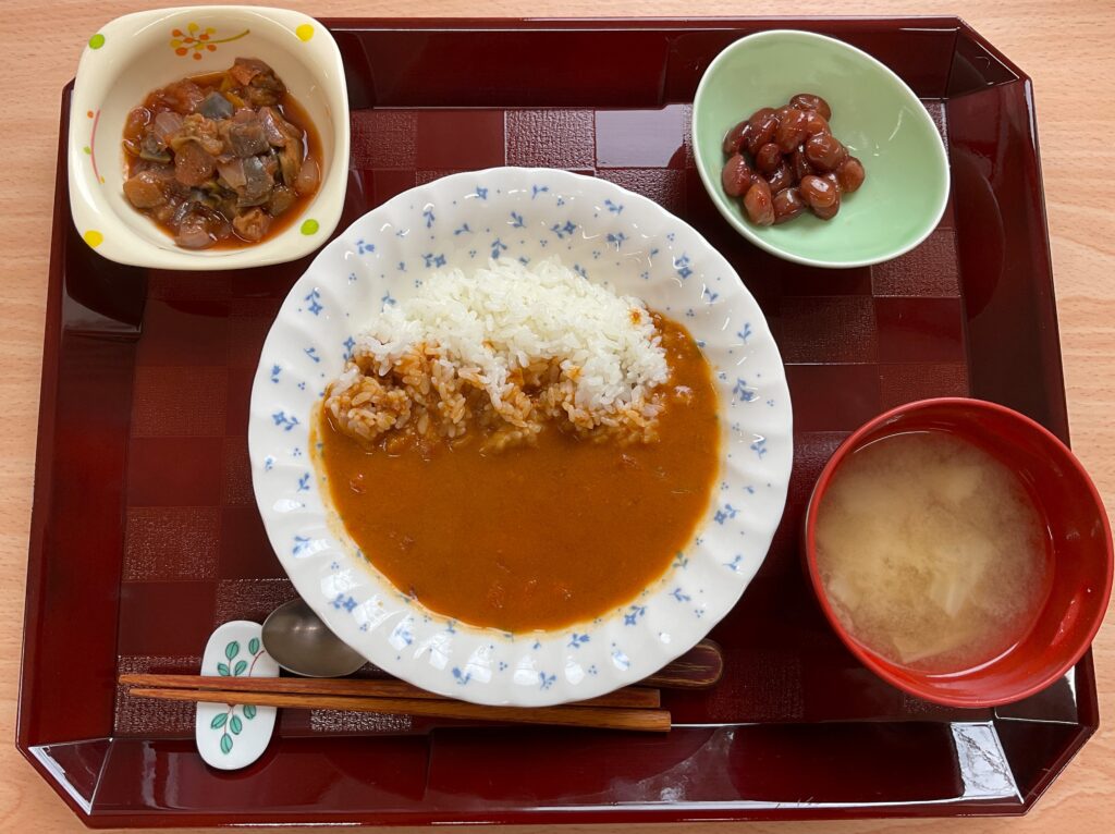 昔ながらのチキンカレー🍛、なすトマト煮、金時豆、みそ汁(白菜、人参)