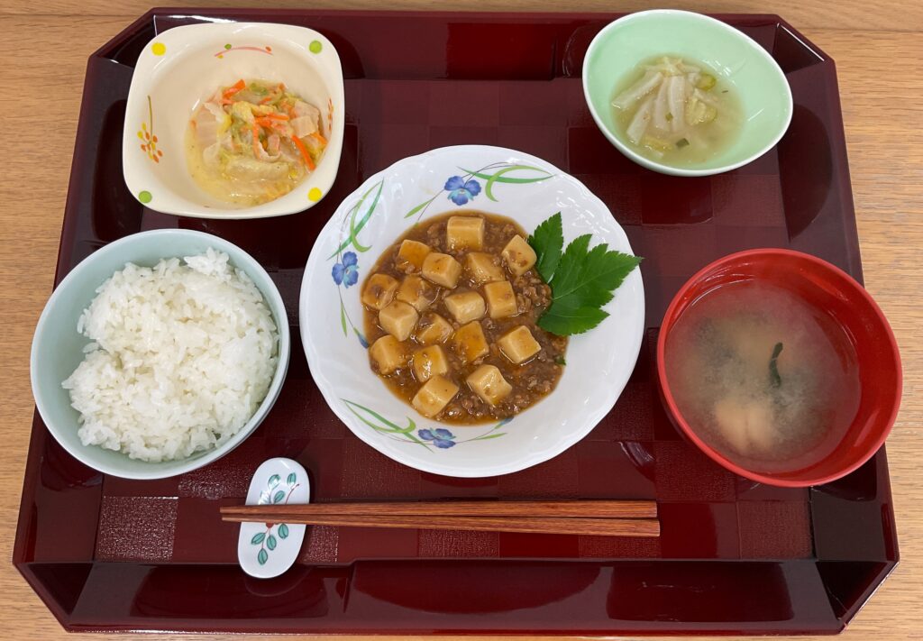 ご飯、麻婆豆腐、セロリと大根の鶏白湯風、白菜のマスタードサラダ🥗、みそ汁(小松菜、麩)