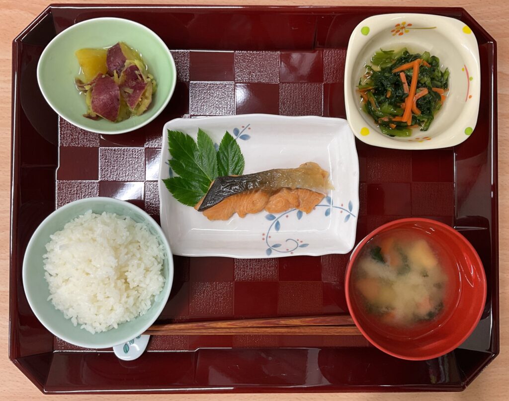 ご飯、マス旨塩焼き、さつまいも🍠の甘露煮、春菊の和え物、みそ汁(小松菜、人参、麩)