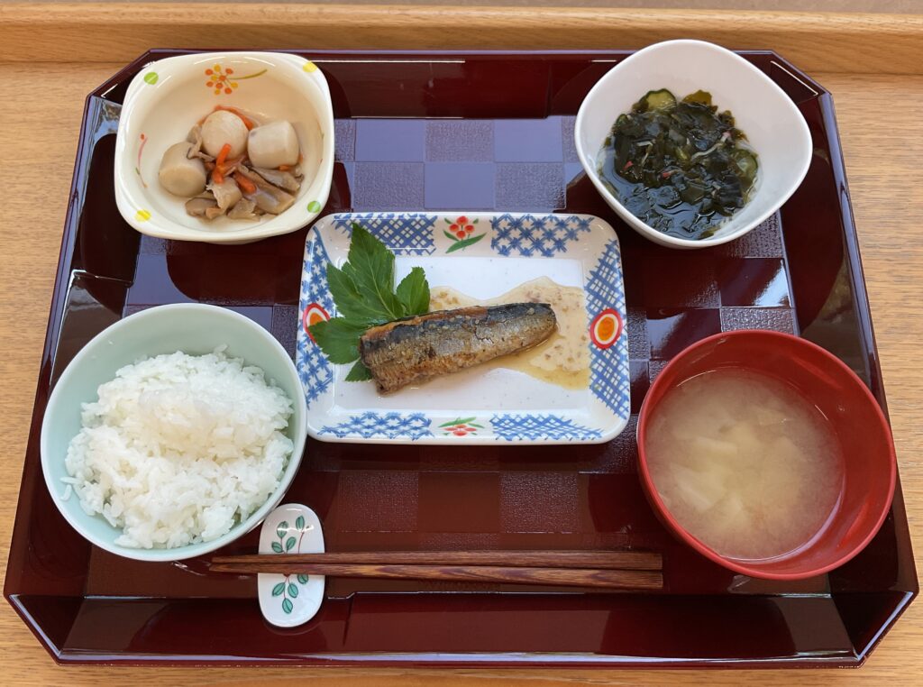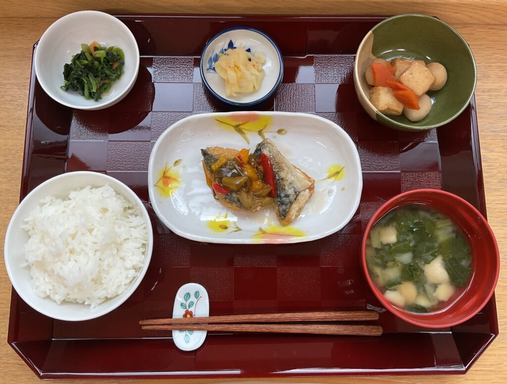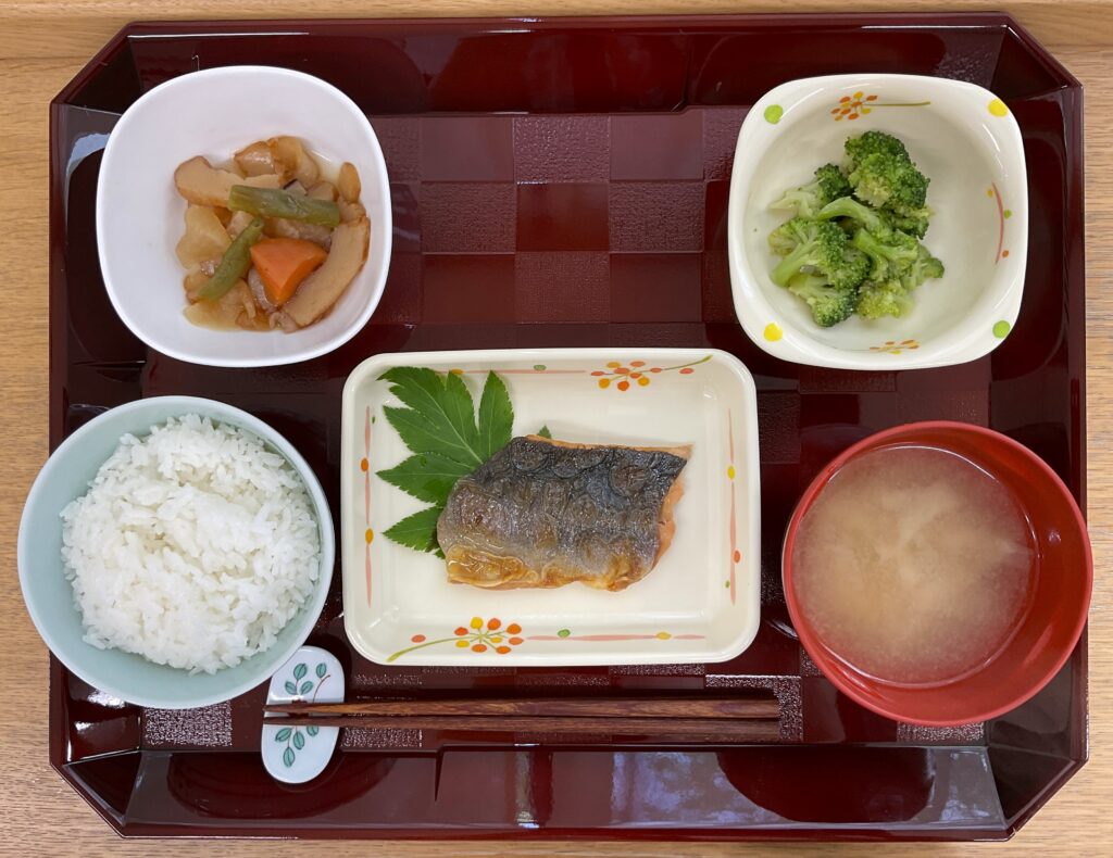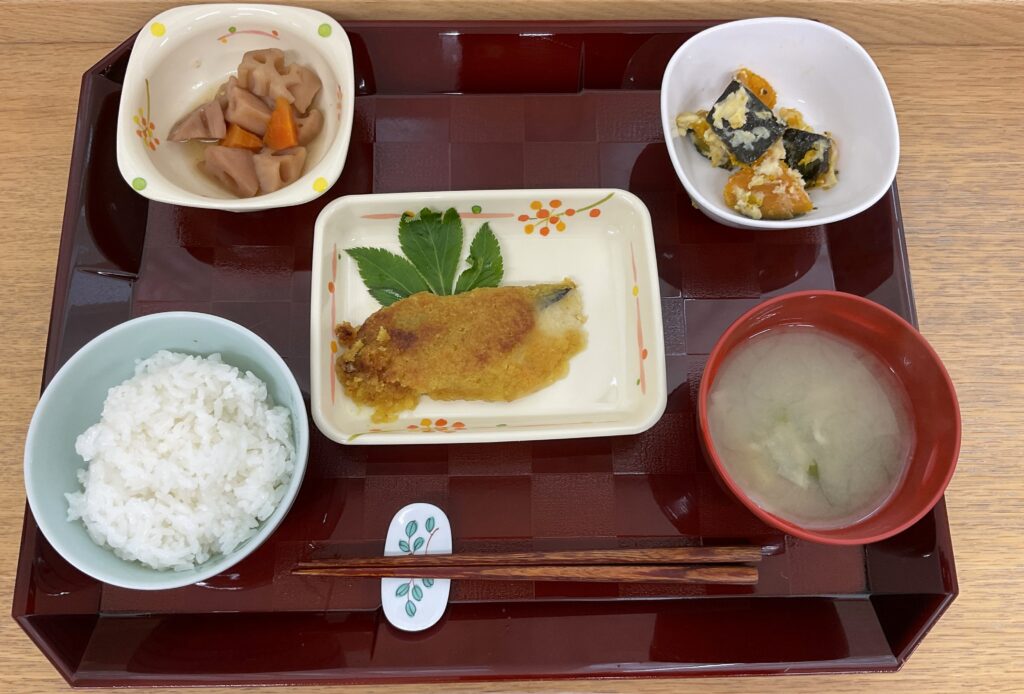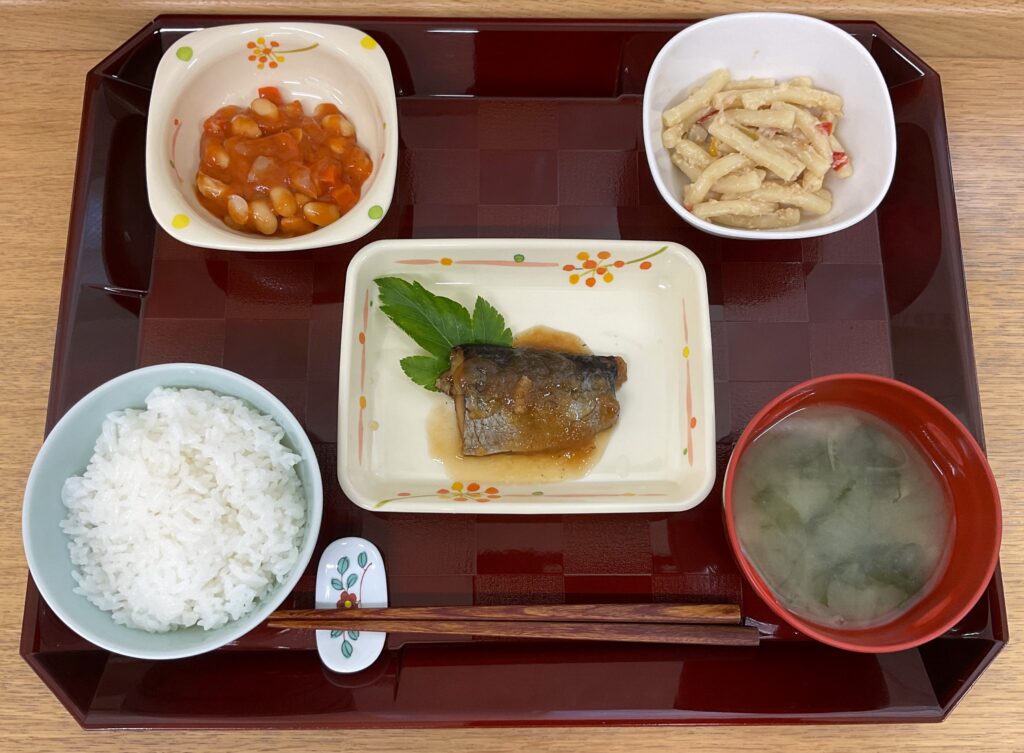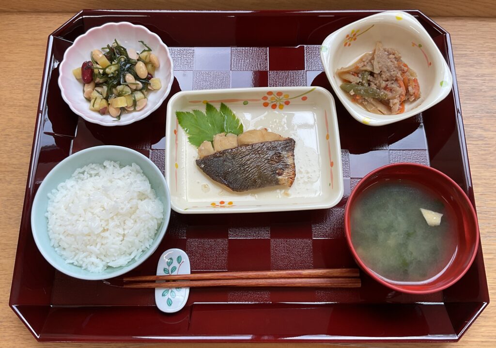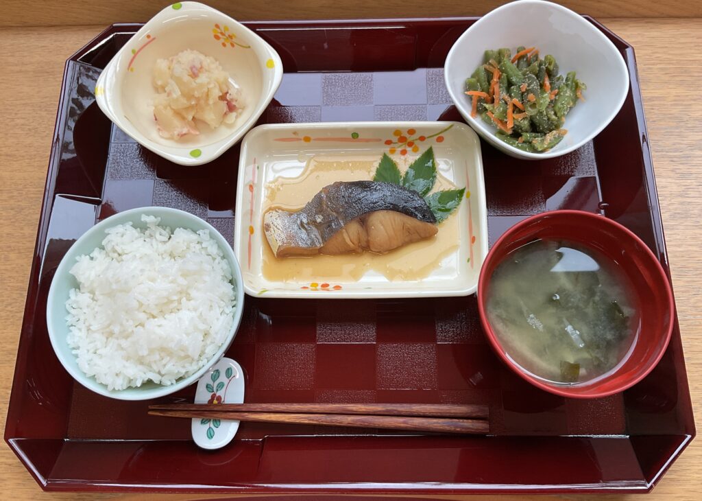 ご飯、シイラの煮付け、ジャーマンポテト🥔、いんげんの胡麻和え、みそ汁(玉ねぎ、わかめ)