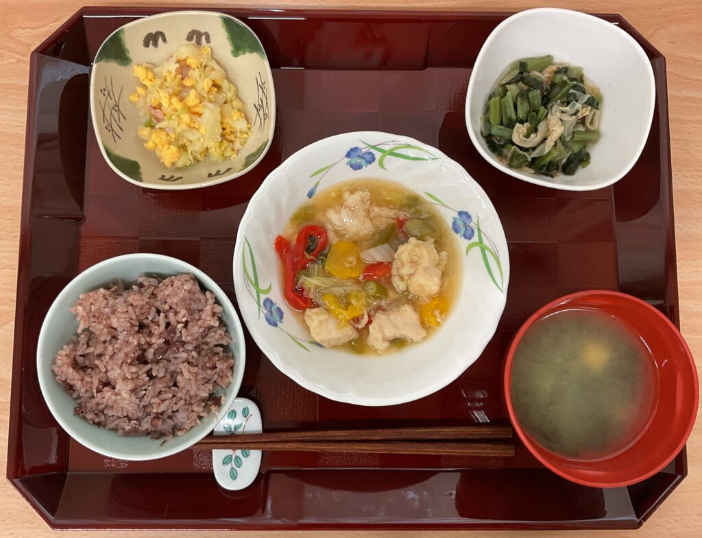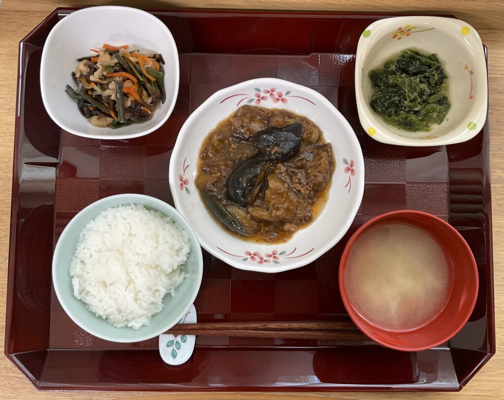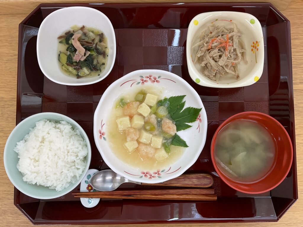 とうもろこし🌽ご飯、さわらネギ味噌煮、ツナ入りじゃが煮、オクラと人参の和え物、四角豆の胡麻和え、みそ汁(豆腐、わかめ)