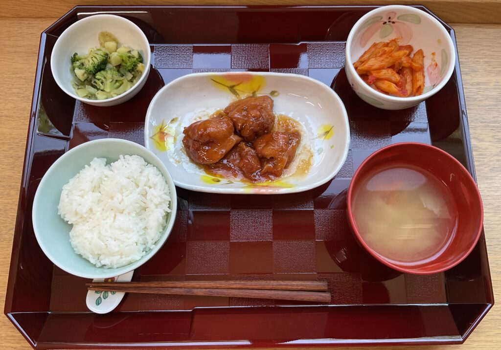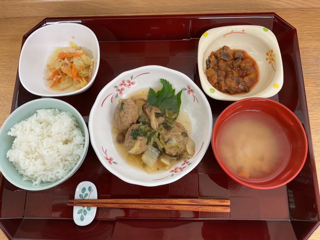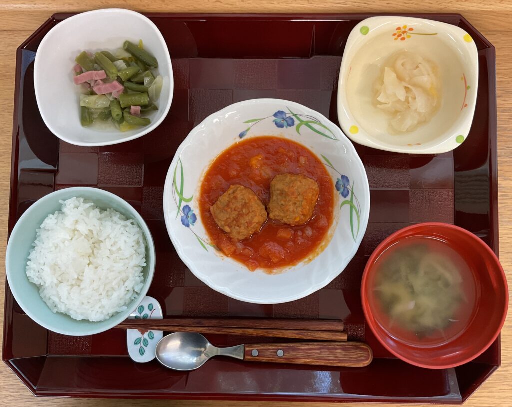 ご飯、肉団子と野菜のトマト🍅煮、インゲンとハムのコンソメ煮、ゆず大根、みそ汁(玉ねぎ、わかめ)