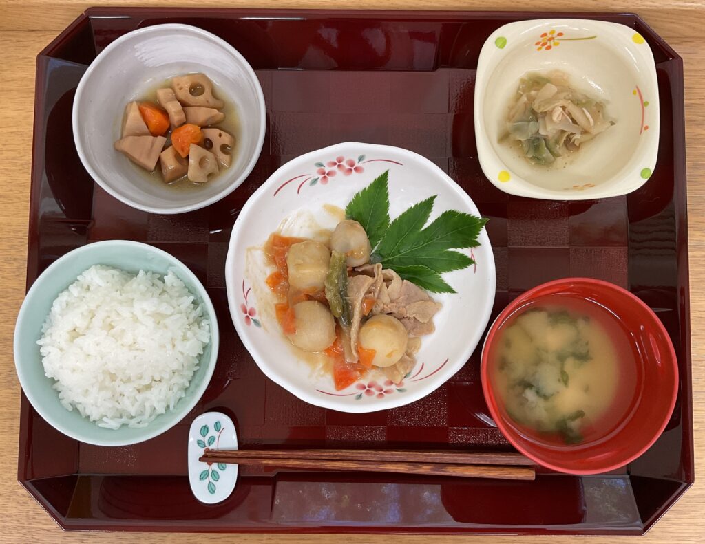 ご飯、里芋と豚肉の味噌煮、れんこんの炒め物、蒸し鶏のザーサイ、みそ汁(畑菜🥬、麩)