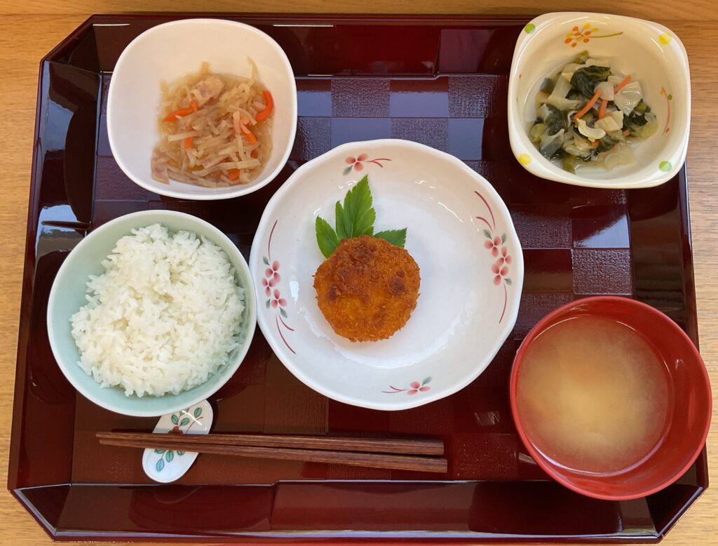 ご飯、エビ🦐カツ、切干の洋風煮、彩り野菜のお浸し、みそ汁(大根、人参、油揚げ)