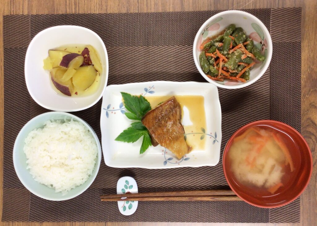 ご飯、鶏肉団子の甘酢あん、ツナ入りじゃが煮、ひじきのサラダ🥗、みそ汁(根菜、麩、大根)