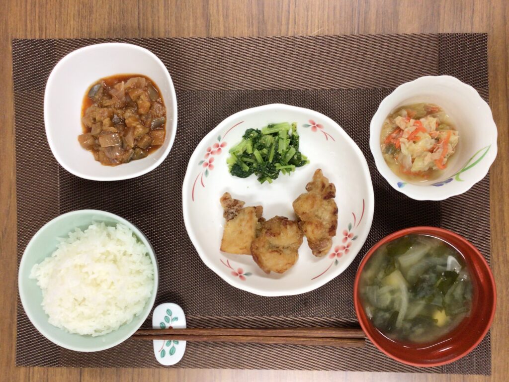 ご飯、ゴマ味噌チキン🍗、白菜の煮びたし、味付けめかぶ、みそ汁(根菜、麩、玉ねぎ)