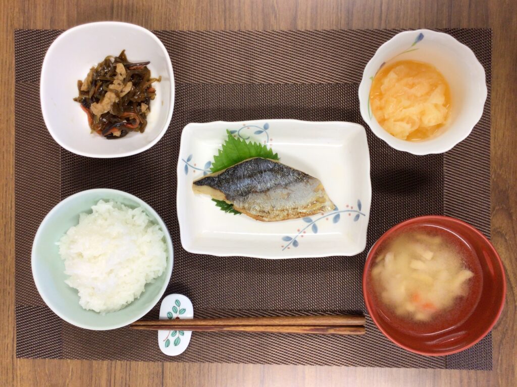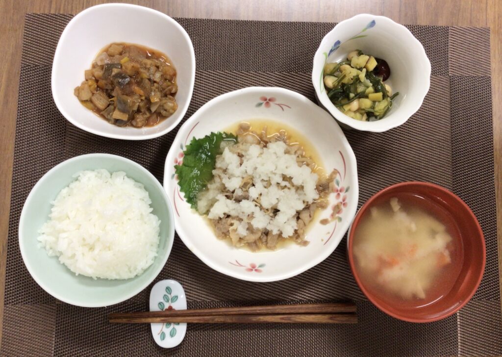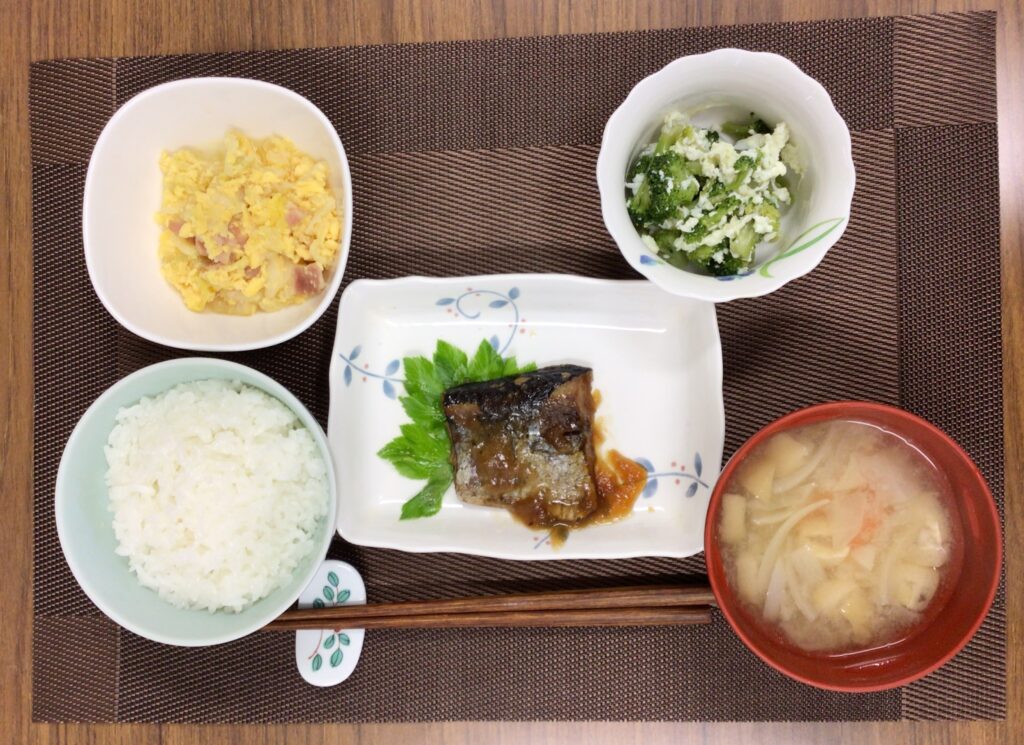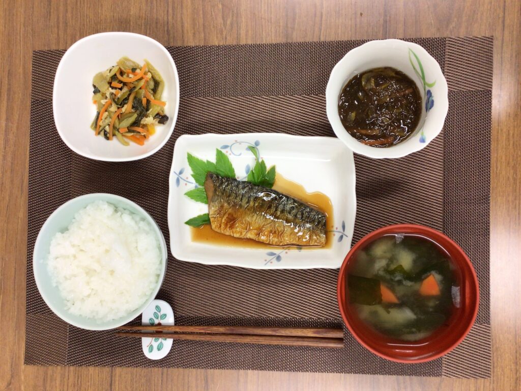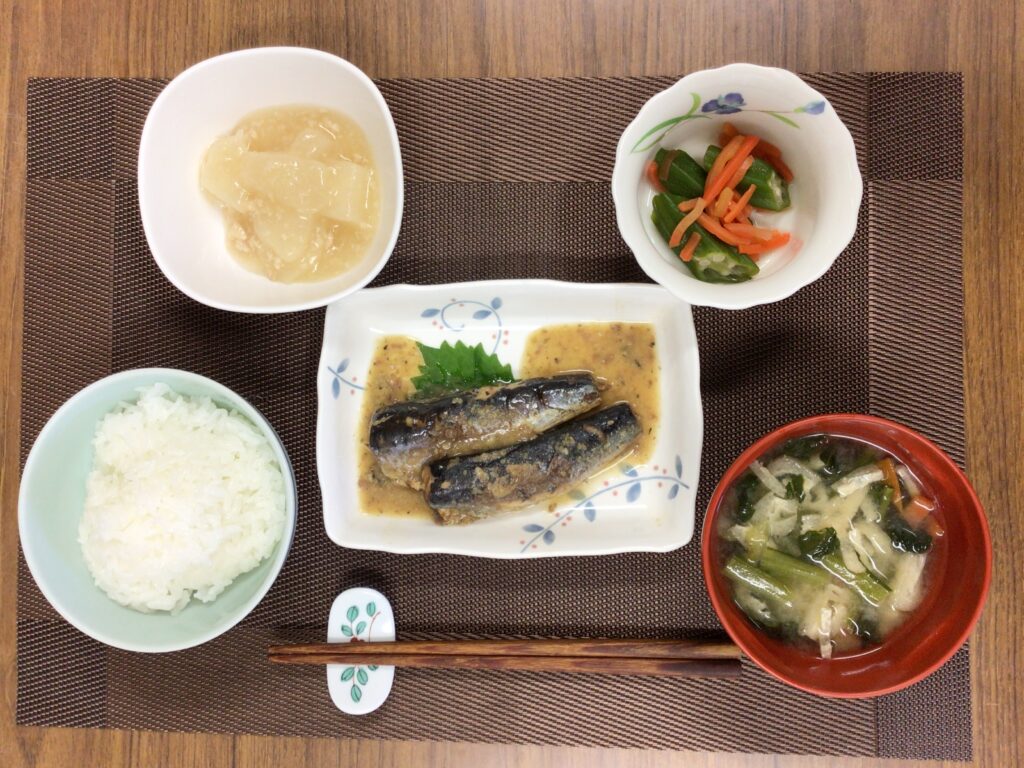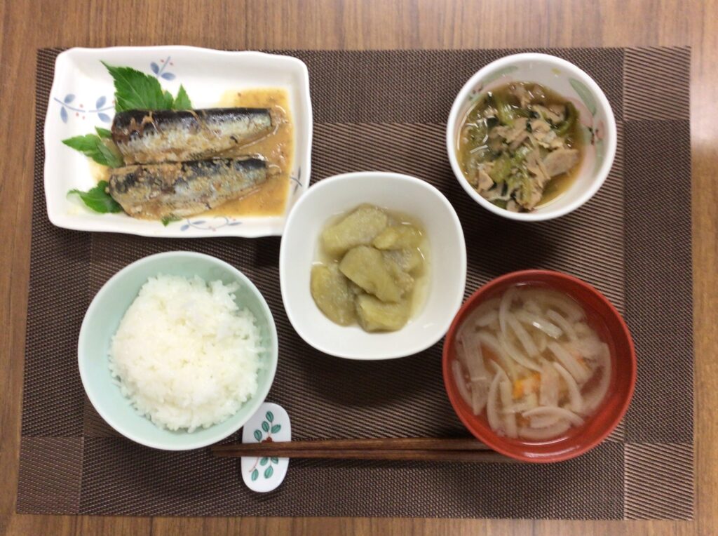 ご飯、いわしゴマ味噌煮、豚肉と小松菜の煮物、なす🍆のお浸し、みそ汁(大根、人参、油揚げ、玉ねぎ)