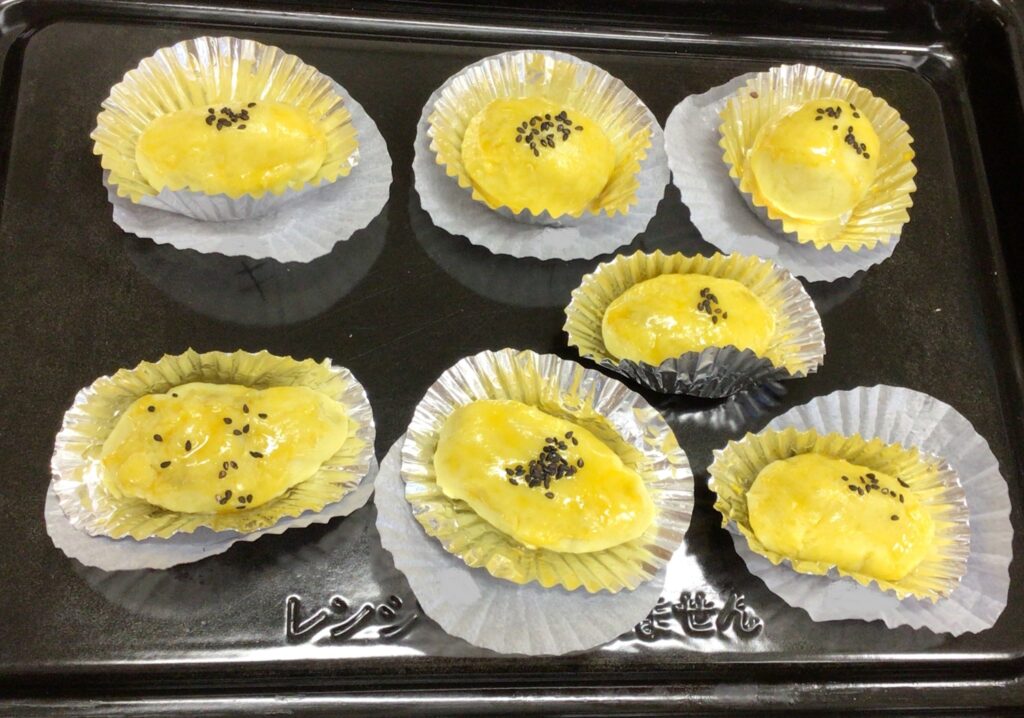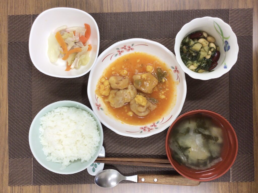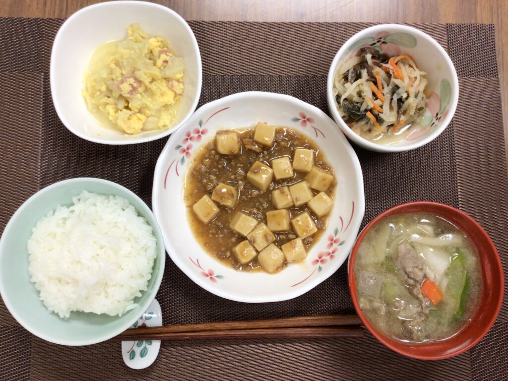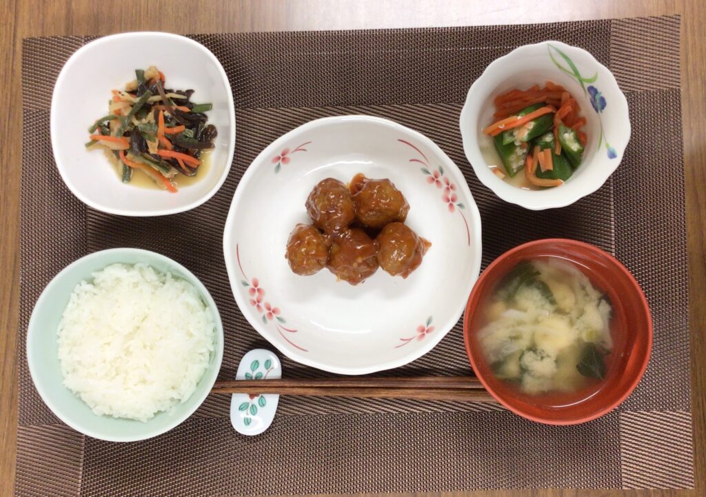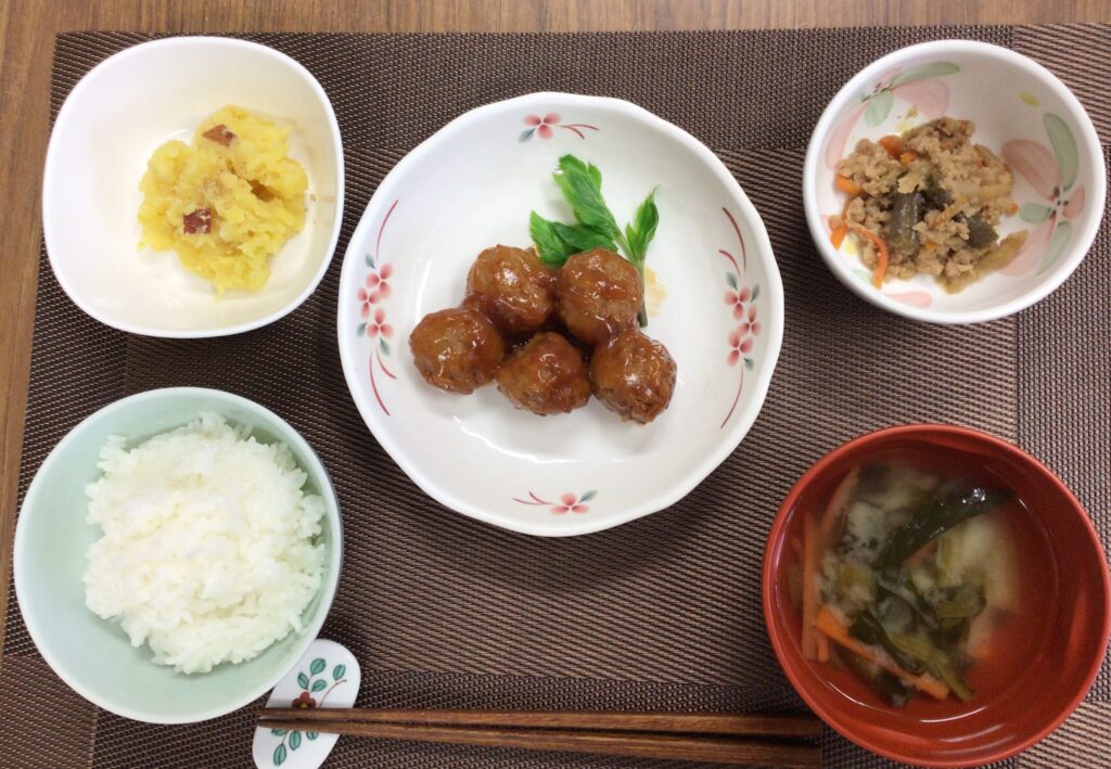 ご飯、鶏肉団子の甘酢あん、ひき肉の炒め煮、さつま芋🍠サラダ、みそ汁(小松菜、人参)