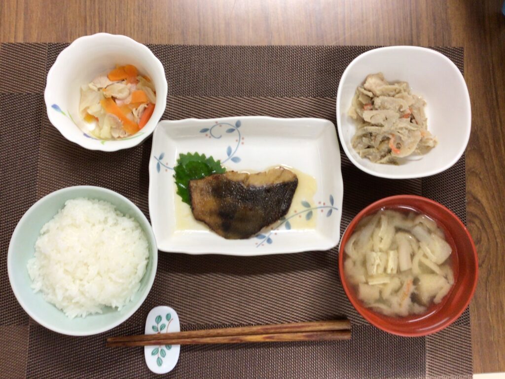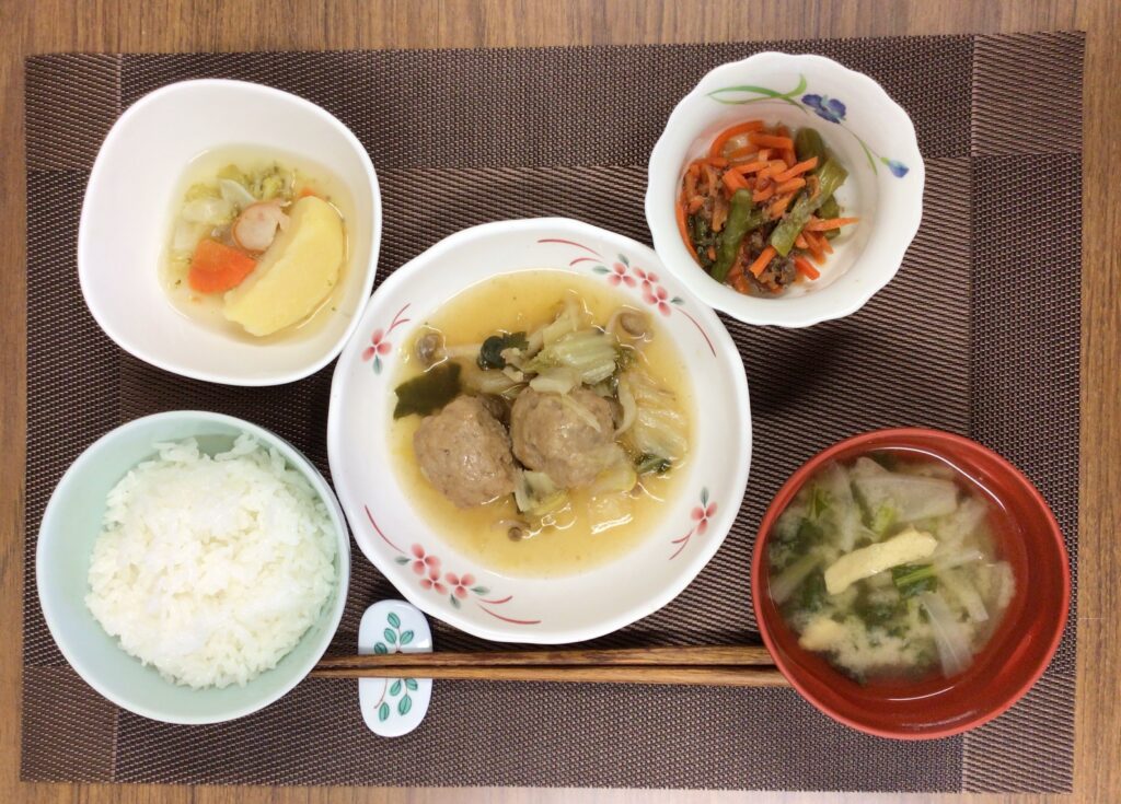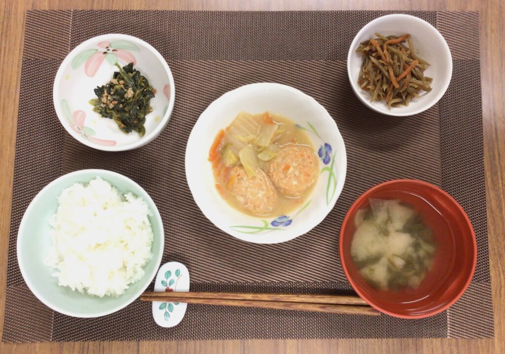 ご飯、鮭つみれの味噌煮、ほうれん草🥬のひき肉和え、きんぴらごぼう、みそ汁(大根、根菜)