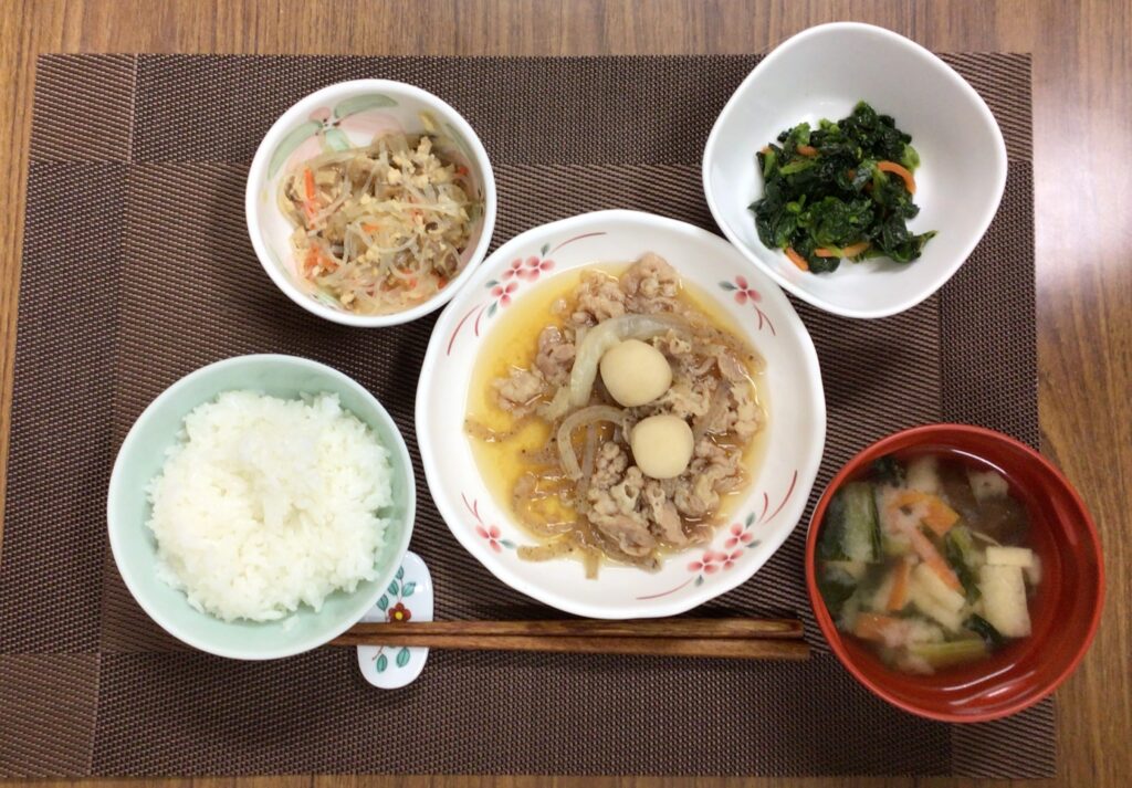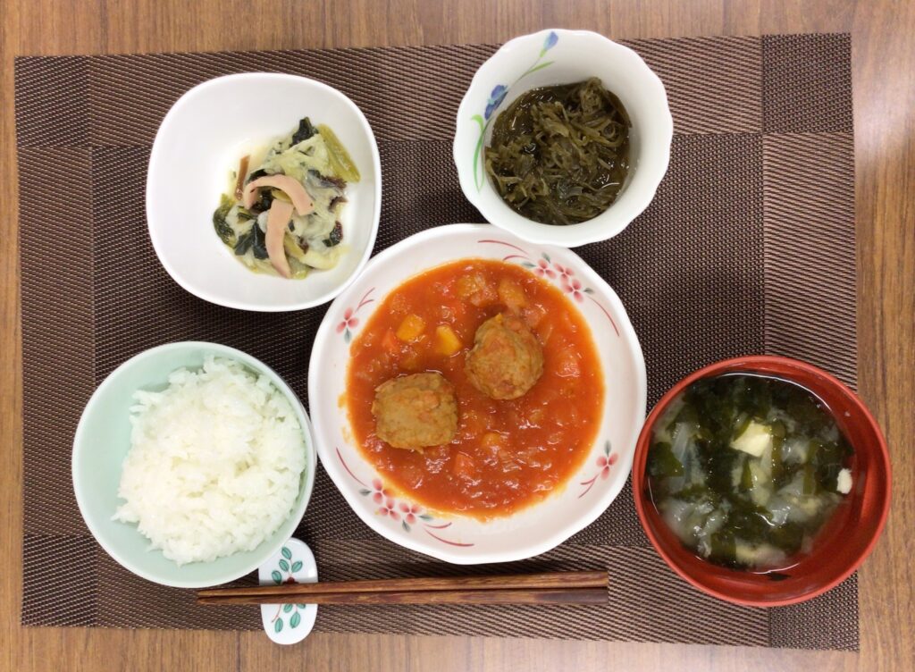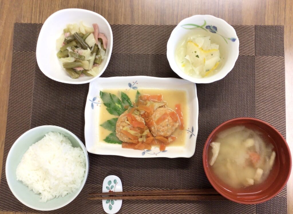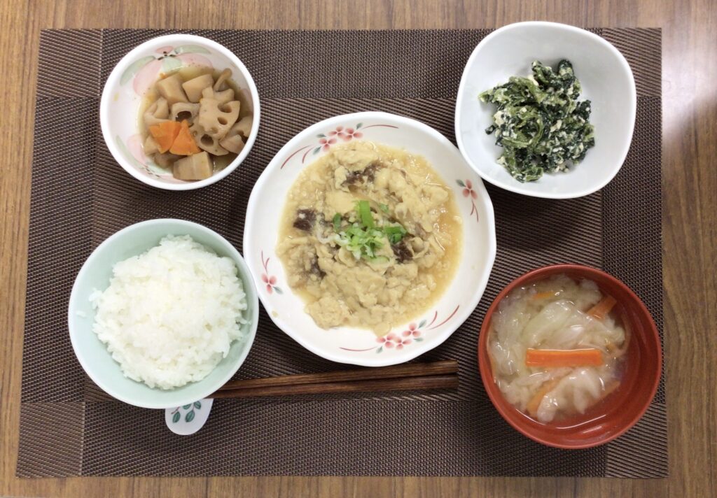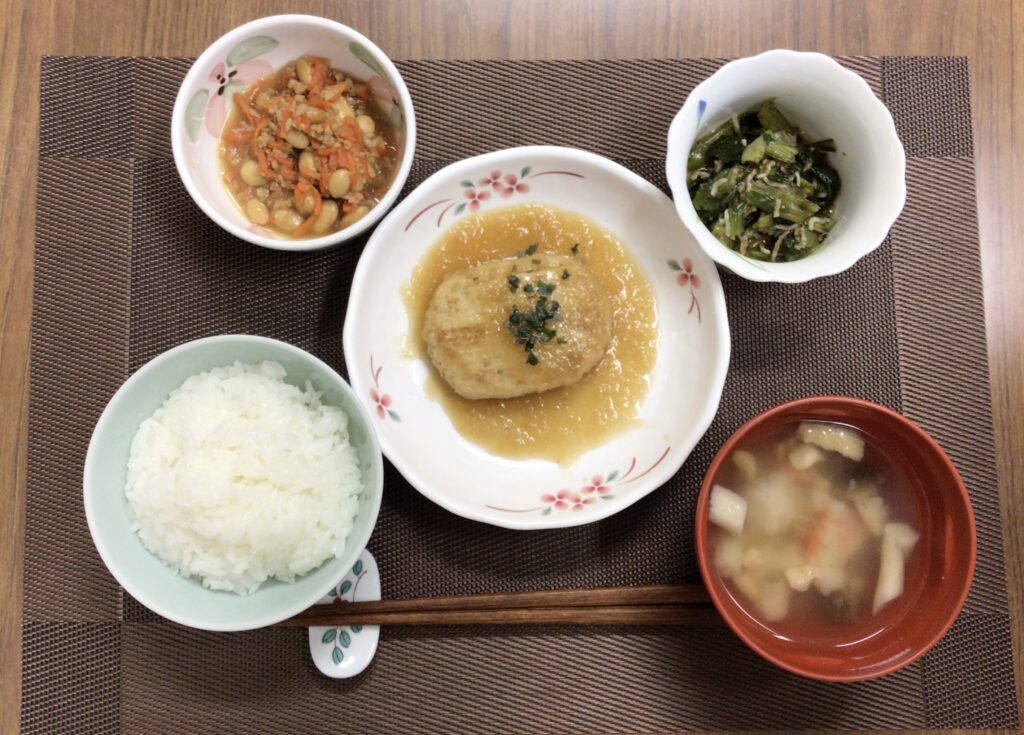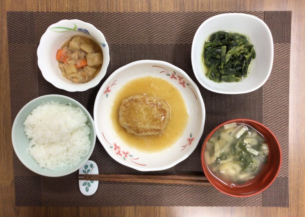 ご飯、豆腐ハンバーグのおろしソース、ツナ入りじゃが🥔煮、ほうれん草のナムル、みそ汁(大根、根菜、油揚げ)