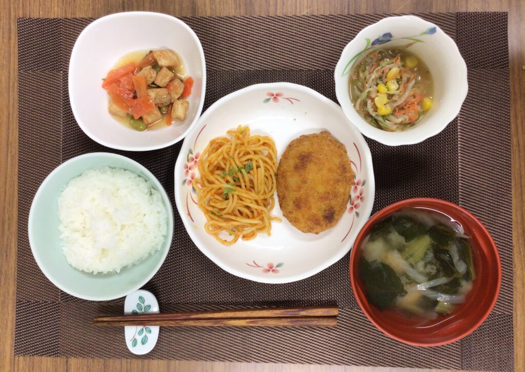 ご飯、北海道男爵コロッケ、添え:トマトパスタ🍝、絹揚げ豆腐の生姜あんかけ、もやしのナムル、みそ汁(小松菜、玉ねぎ、麩)