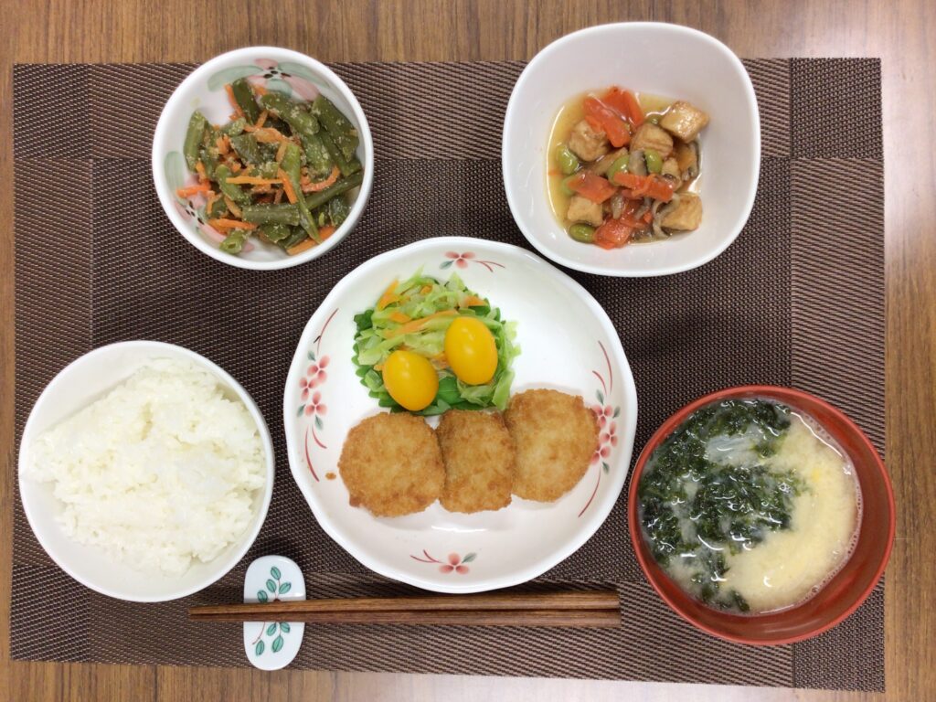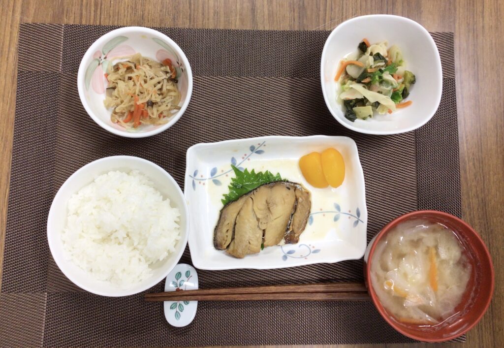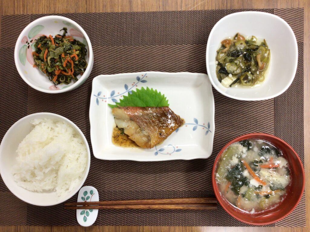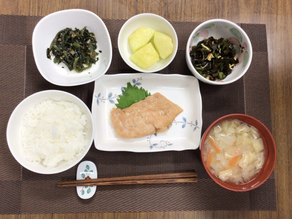 マス旨塩焼き、ほうれん草のひき肉和え、冷凍わかめの酢の物(カニカマ、たまご入り)、みそ汁(キャベツ、人参、油揚げ)、メロン🍈