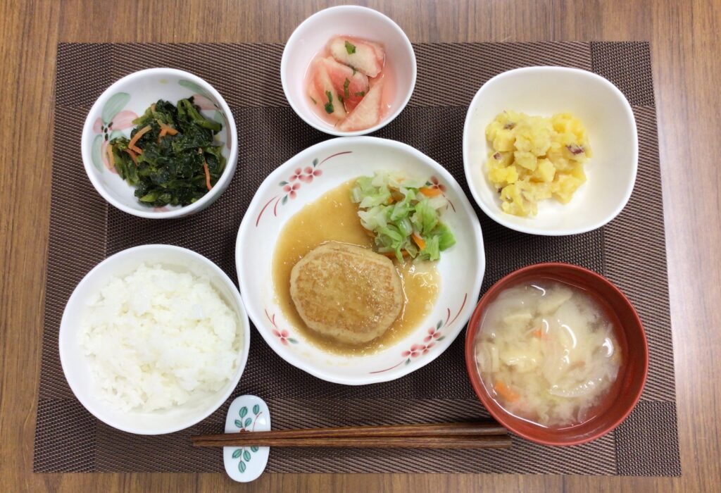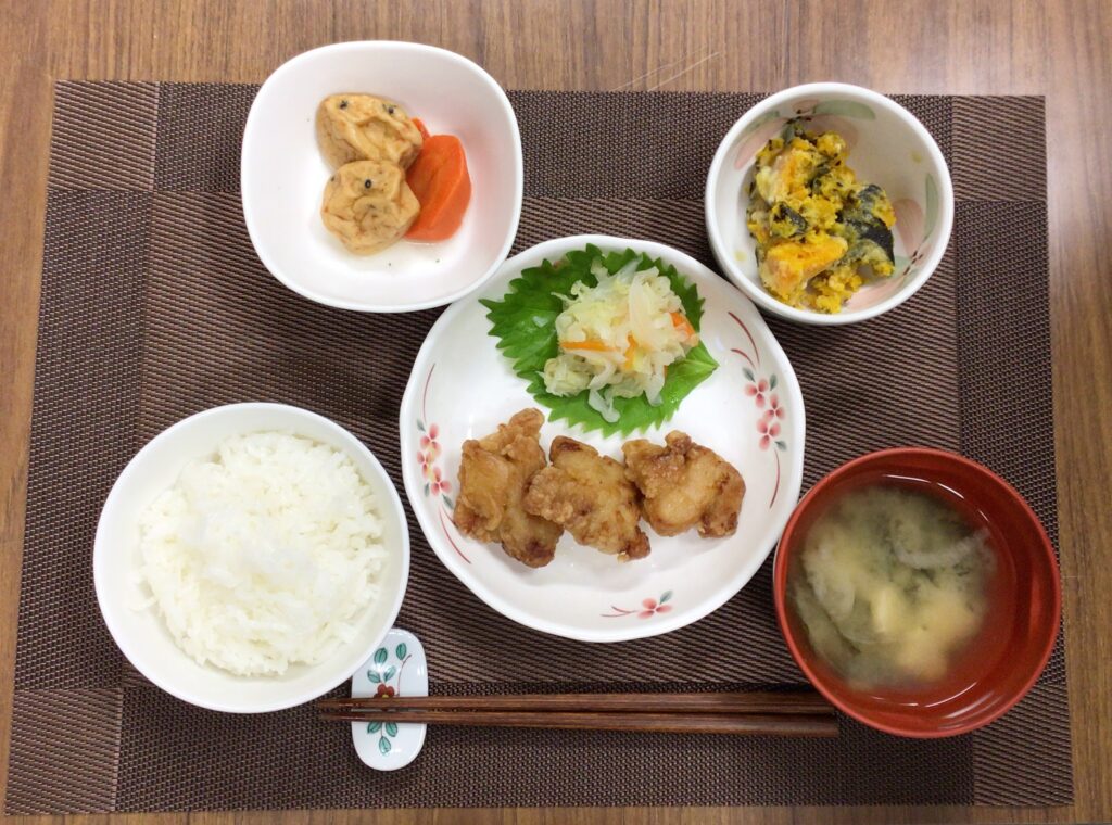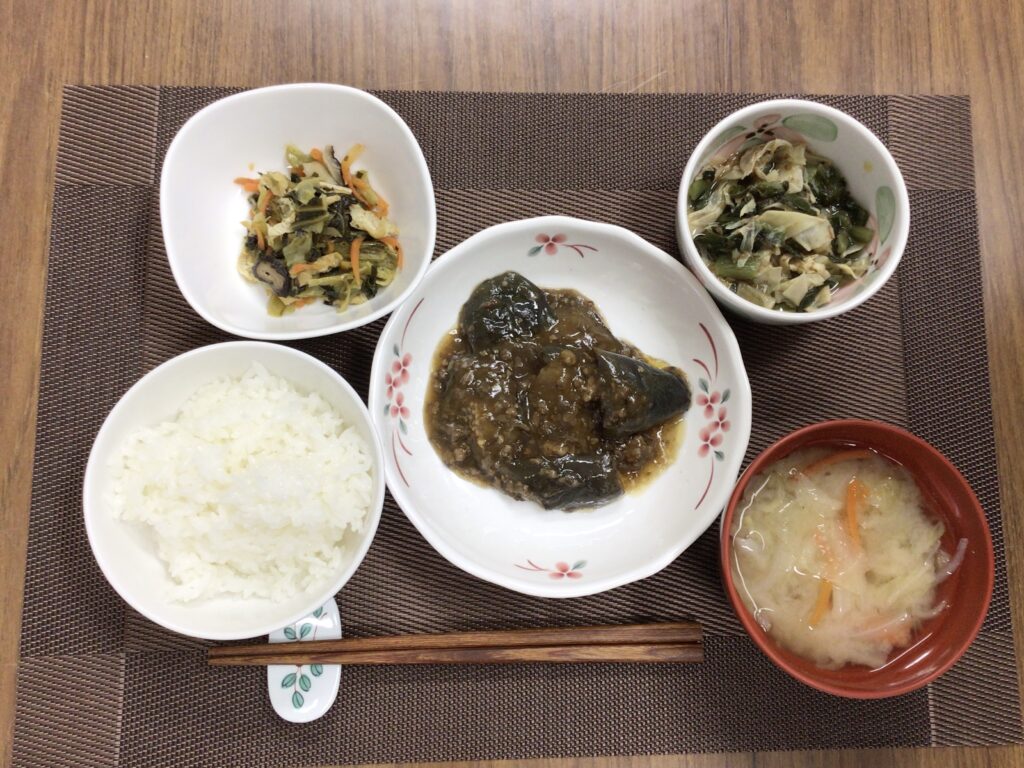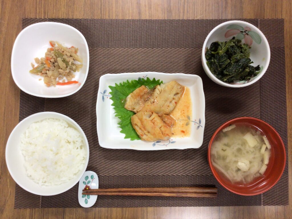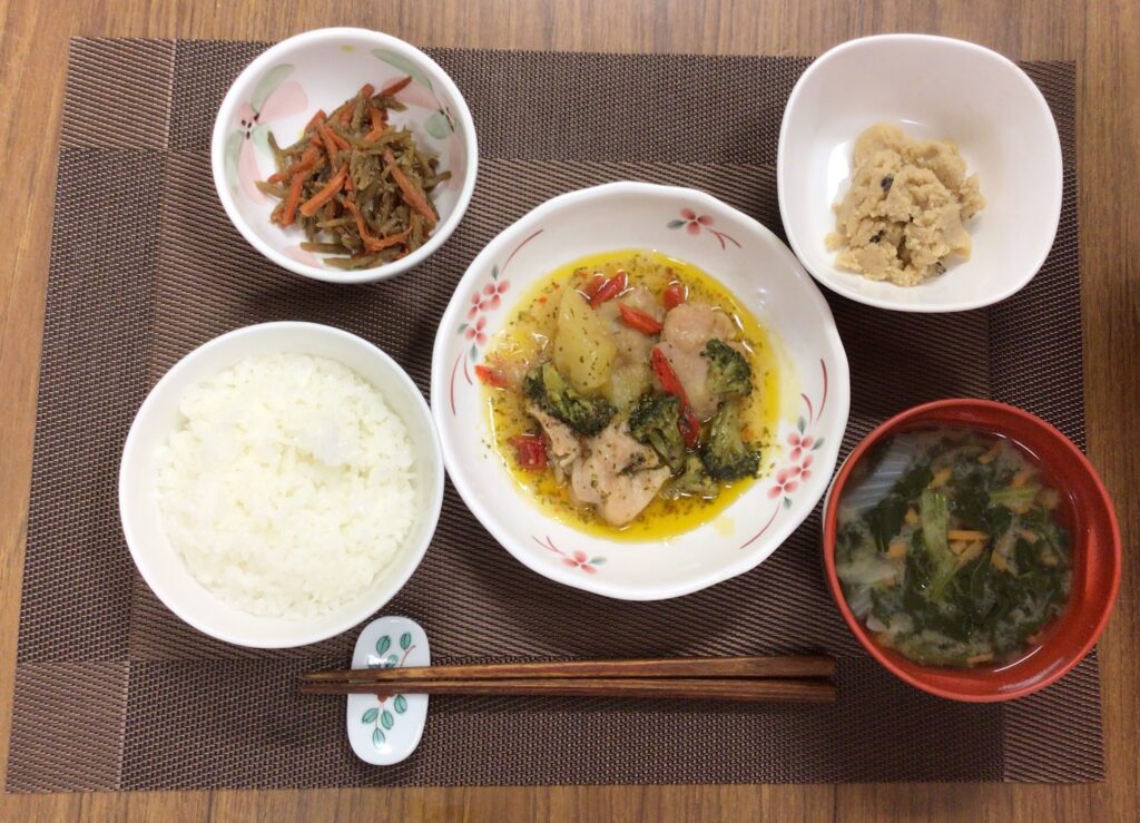 チキンのバジルソース、3種のきのこと豆乳入りうの花、きんぴらごぼう、みそ汁(ほうれん草、人参🥕、玉ねぎ)